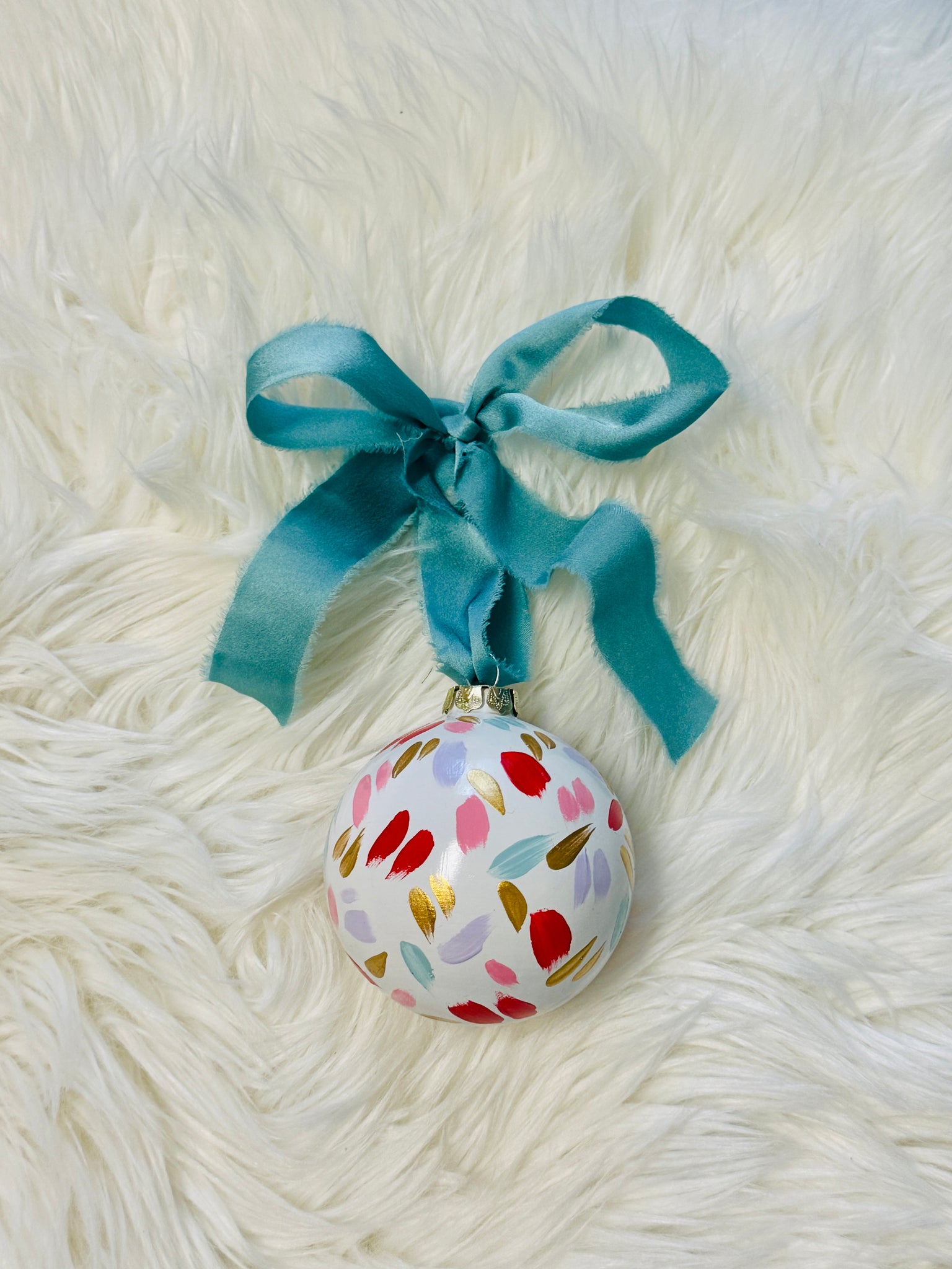 3” round ceramic ornament painted with tied ribbon. Comes with box ready to be gifted!