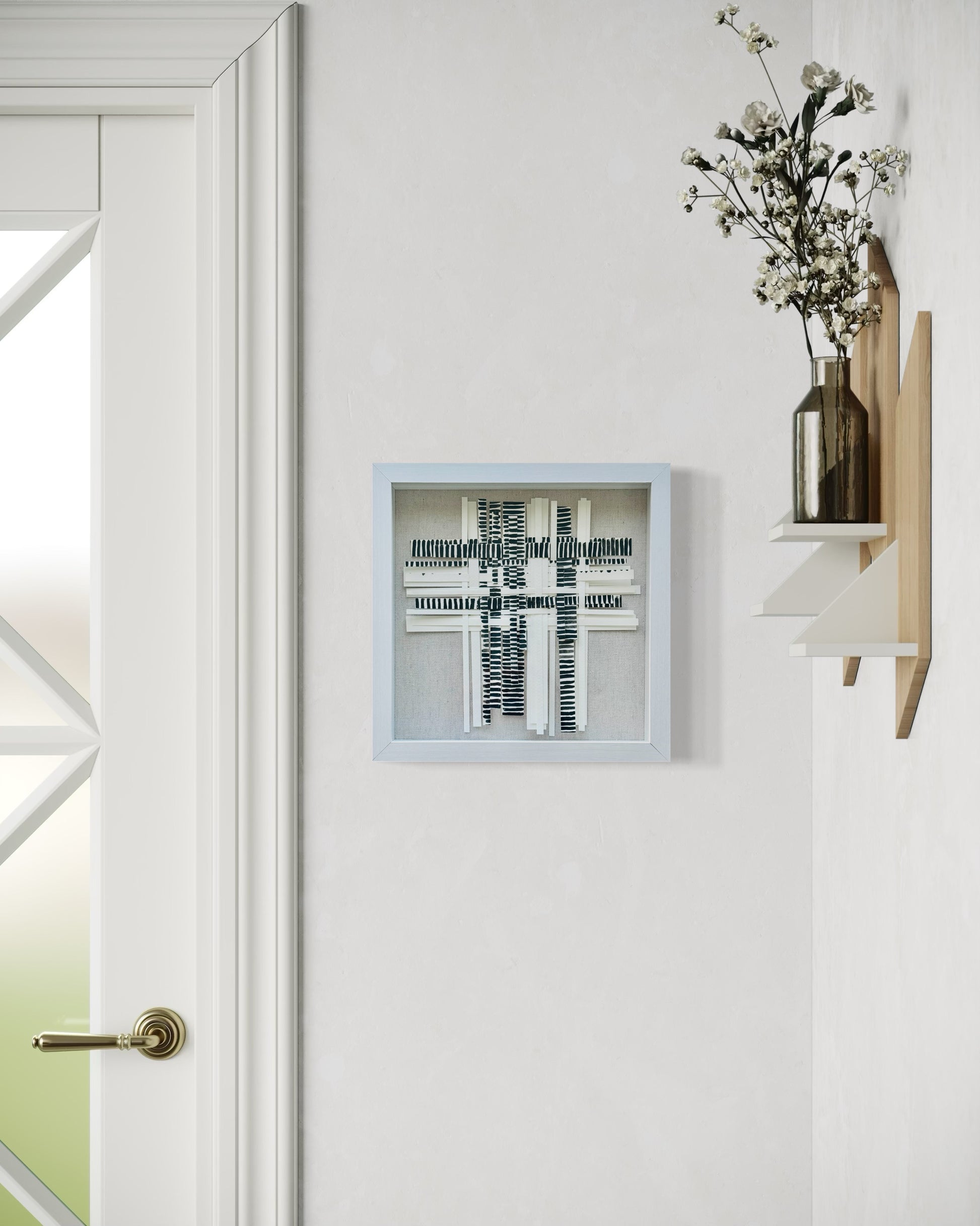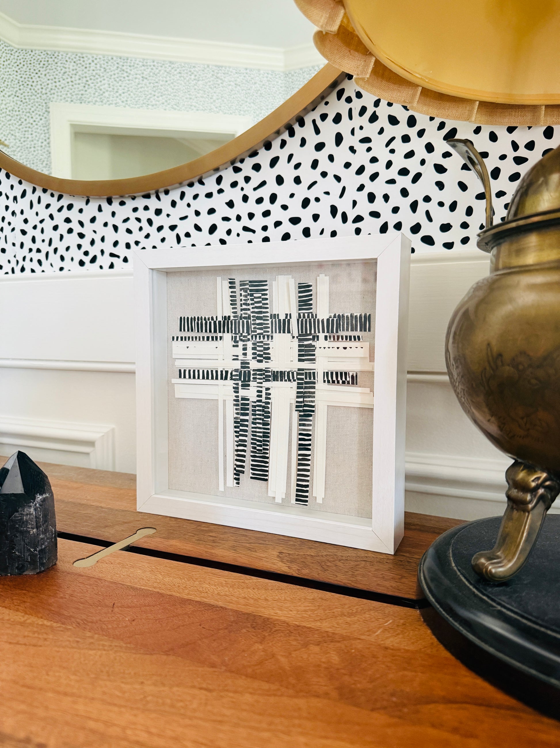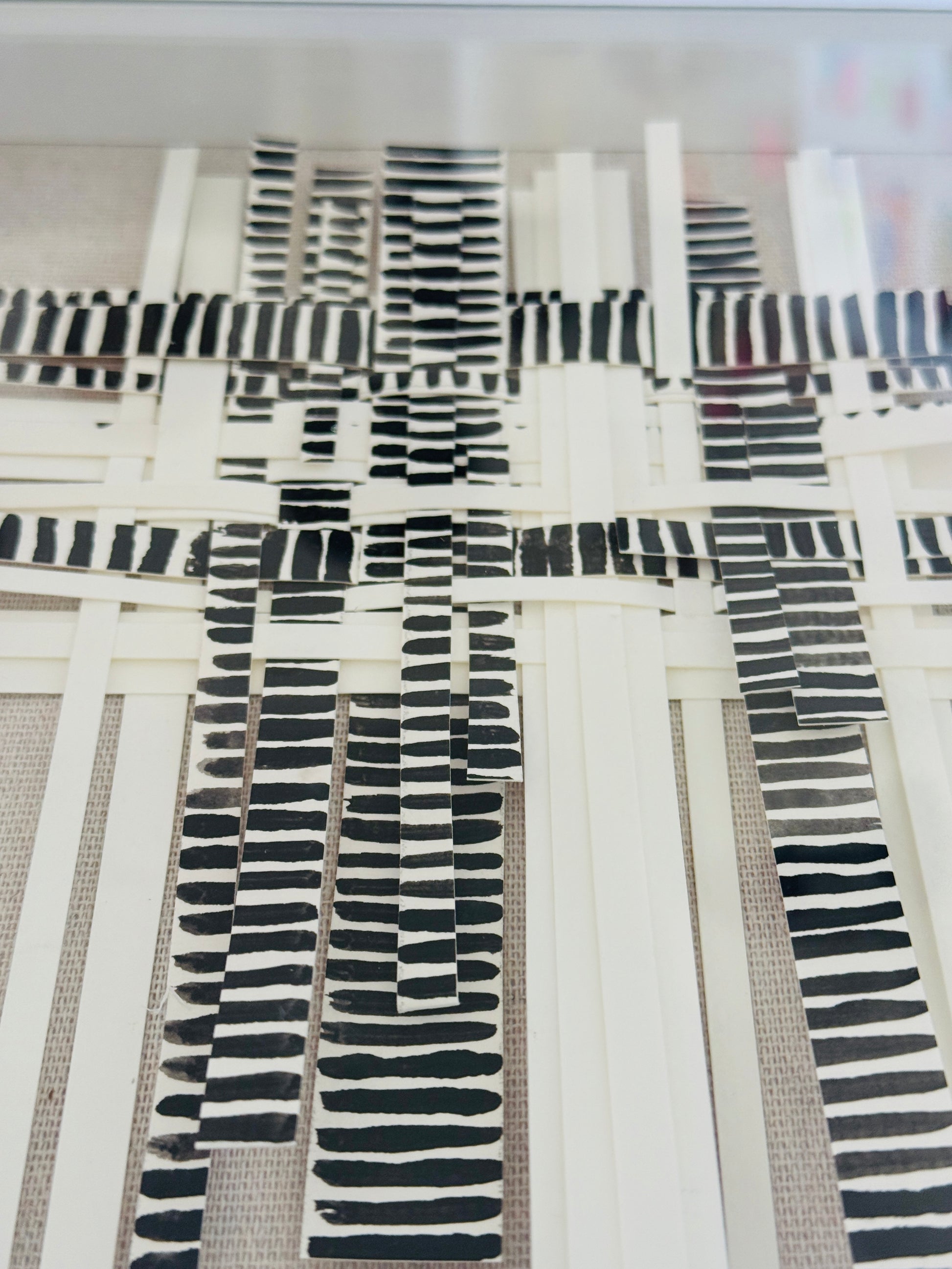 Black and white hand painted acrylic on watercolor paper. The paper is then cut into strips and woven and layered together to create a multidimensional piece