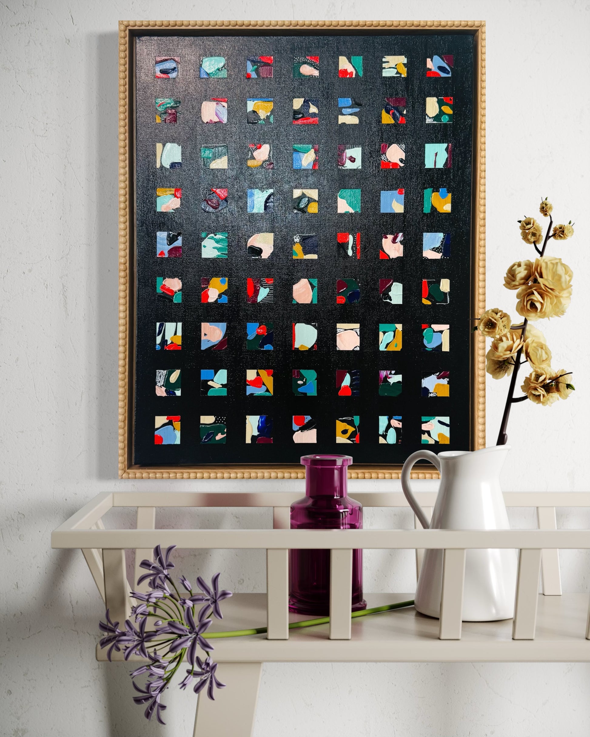 Perfect for modern interior decor, Double Down, adds bold color without overwhelming. The organized geometry brings calm to the vibrant colors and marks.