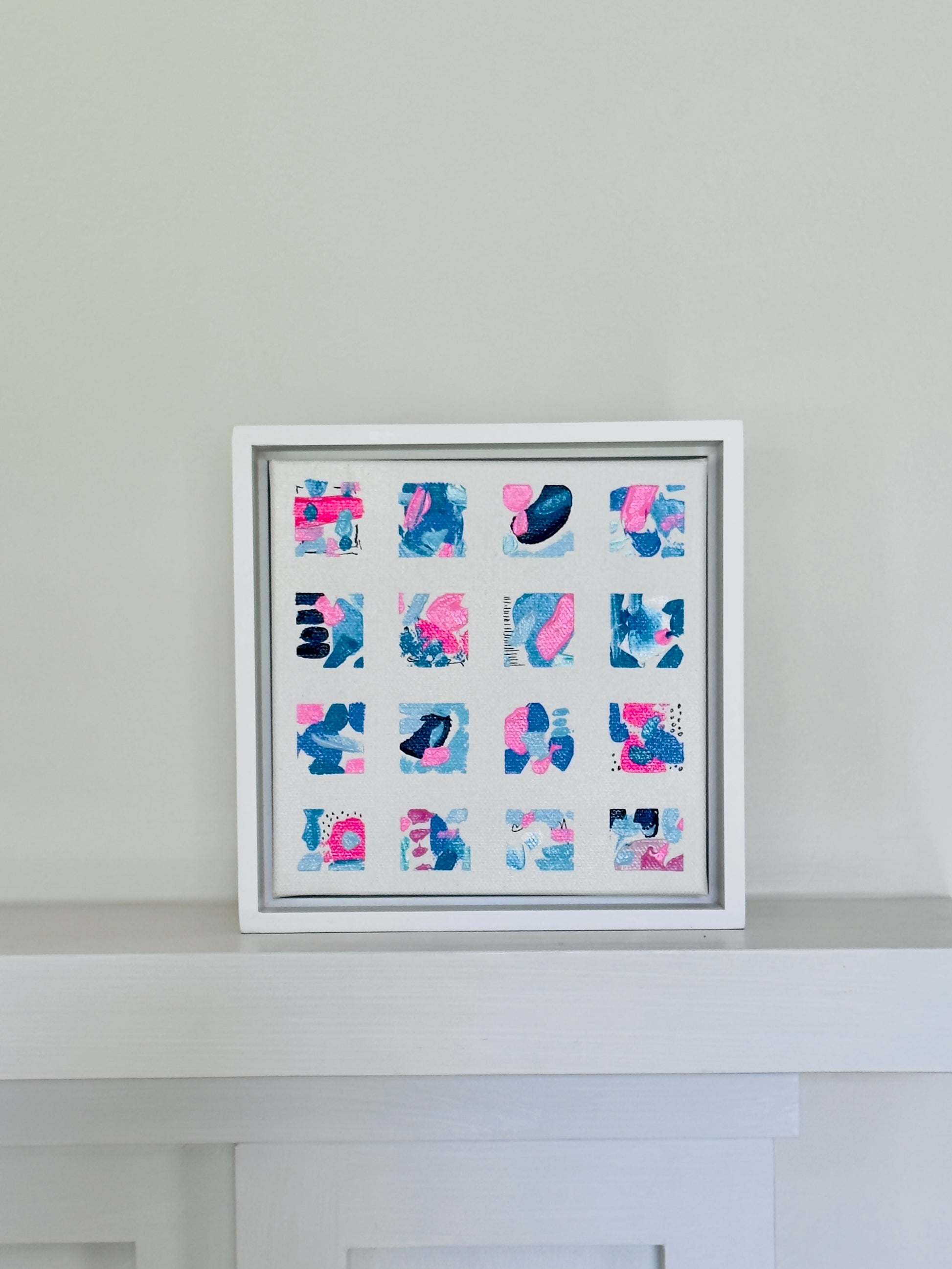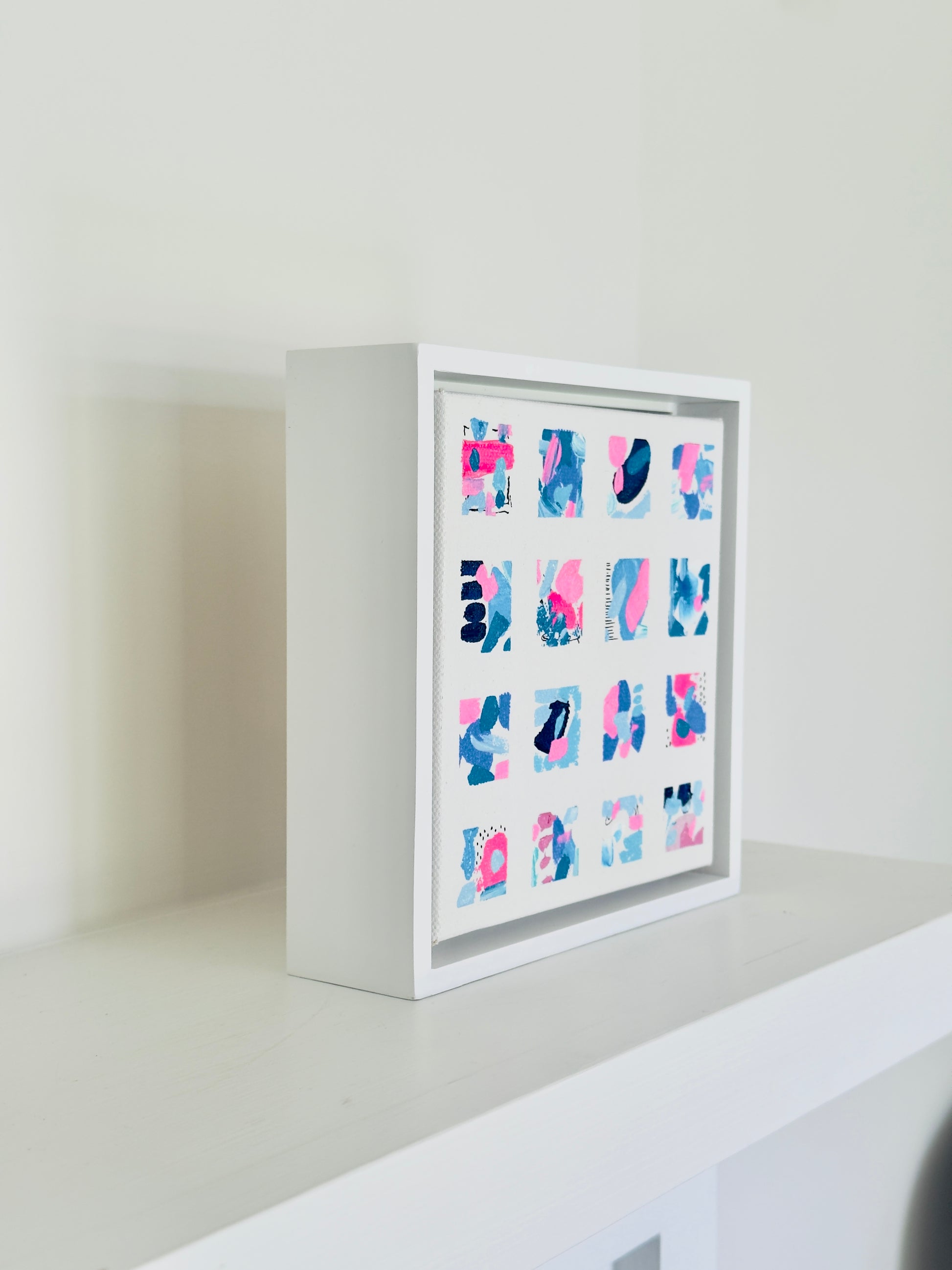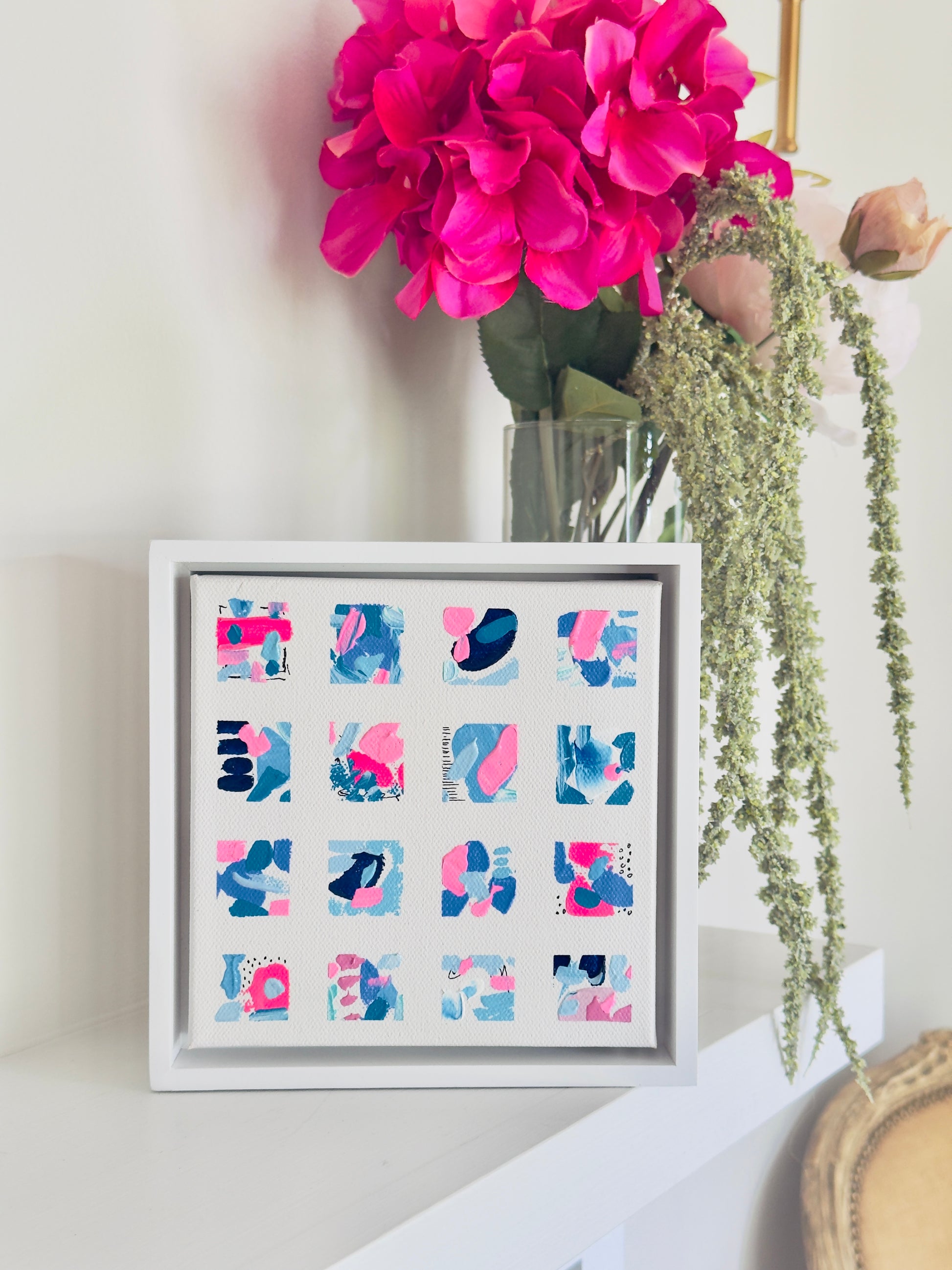 A curated palette of pinks and blues showing showcase bright color in a gorgeous white float gallery frame. Simple Moments is a 6 x 6 acrylic painting that brings fun and whimsy to any room.