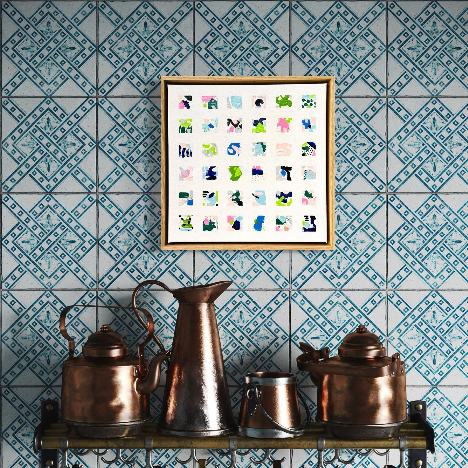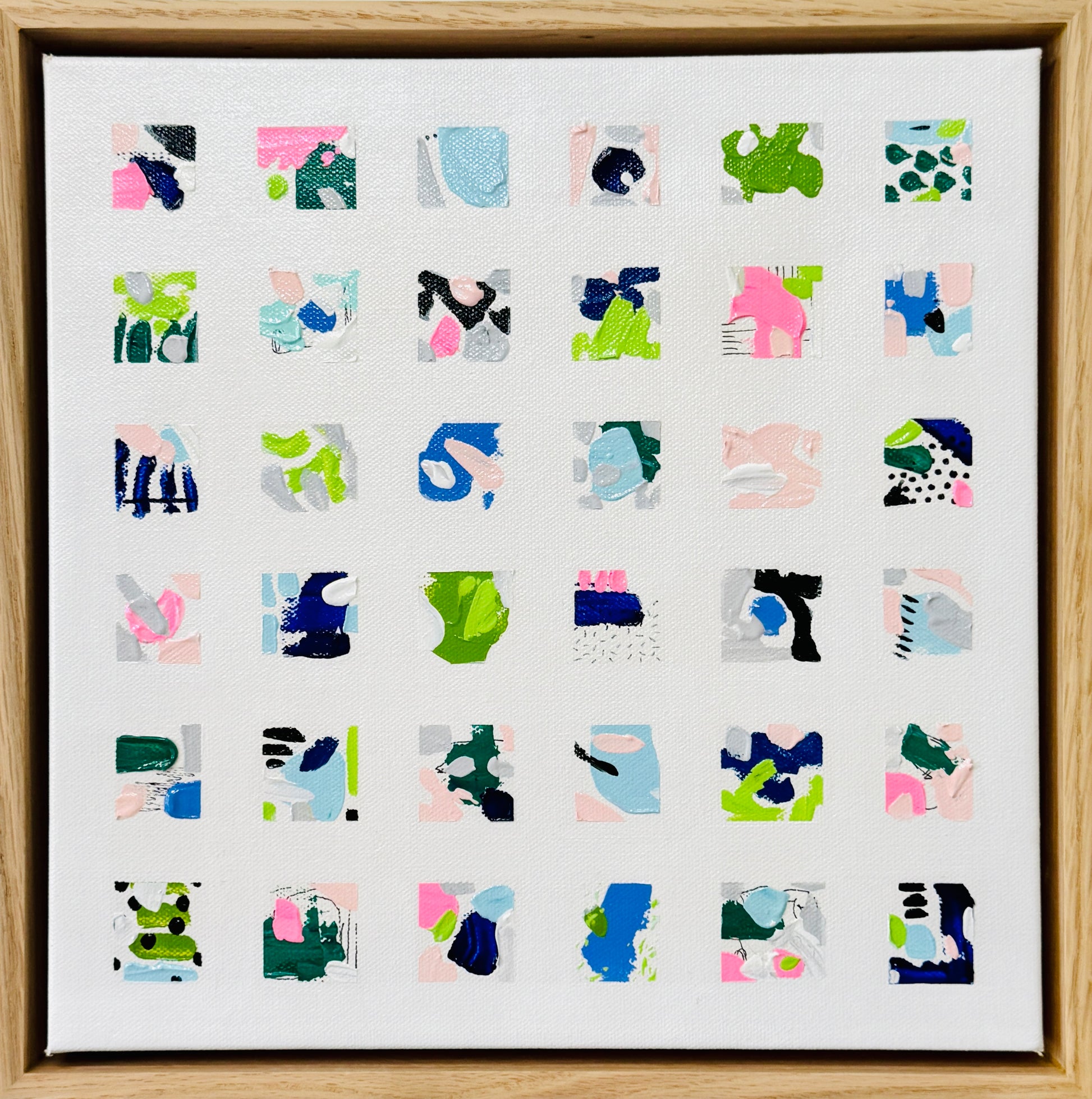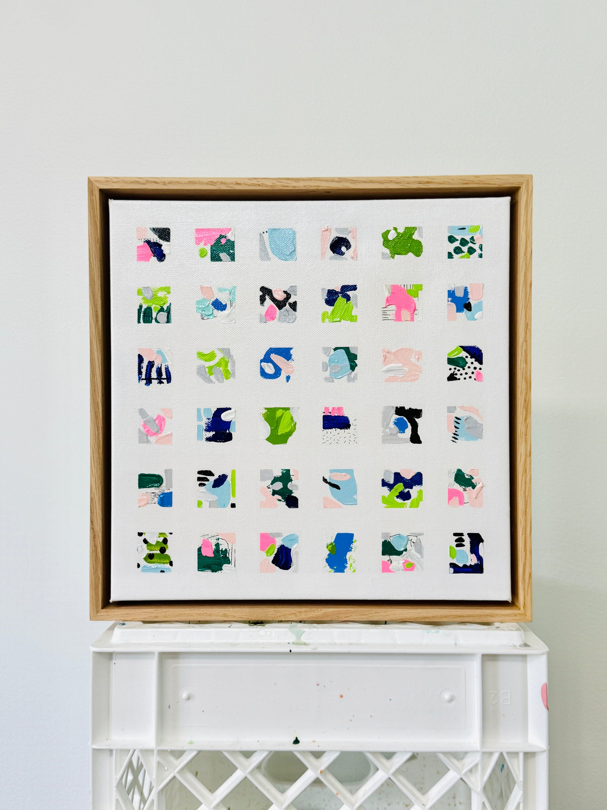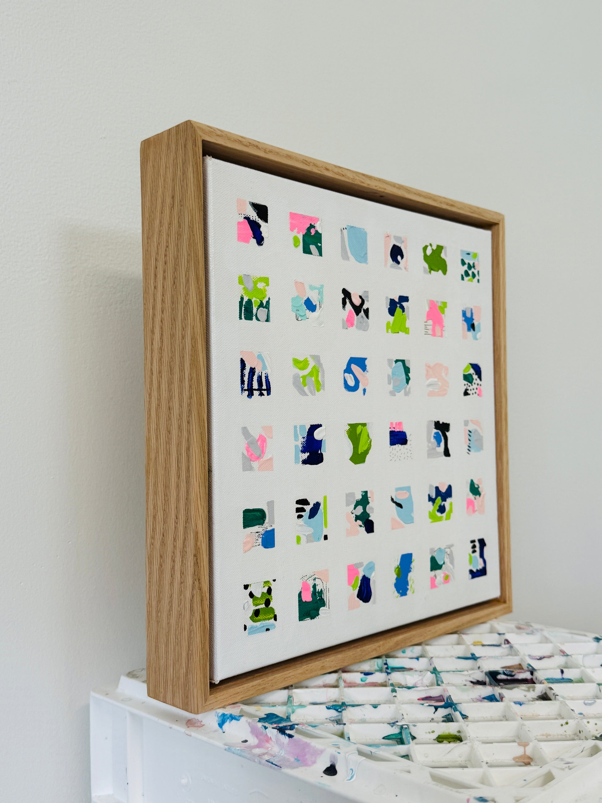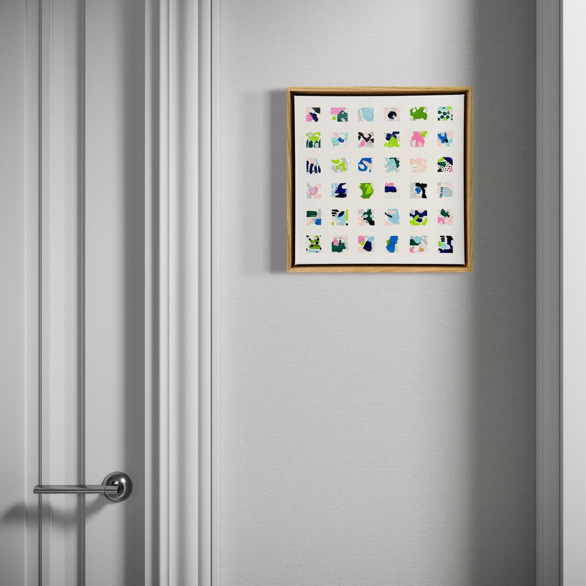 Add a bold statement to your space with Never Miss A Sunrise, a 12 x 12 acrylic paint on canvas, framed in white Oak, that radiates fun and color. This colorful painting inspired by Mexico draws on the rich culture and vivid landscapes of the region, blending lively tones and organic forms in a striking abstract composition.