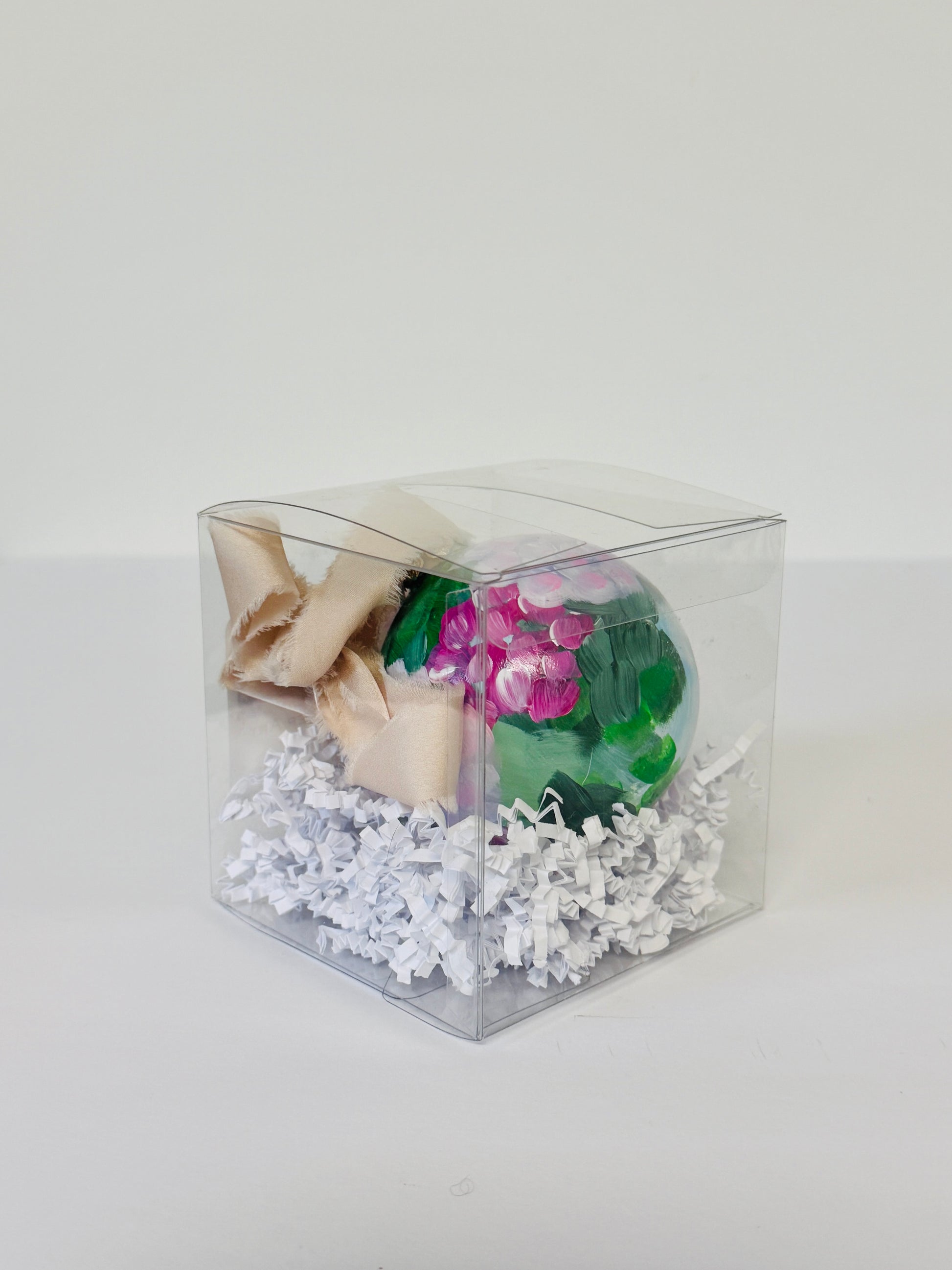 3” round ceramic ornament painted with tied ribbon. Comes with box ready to be gifted!