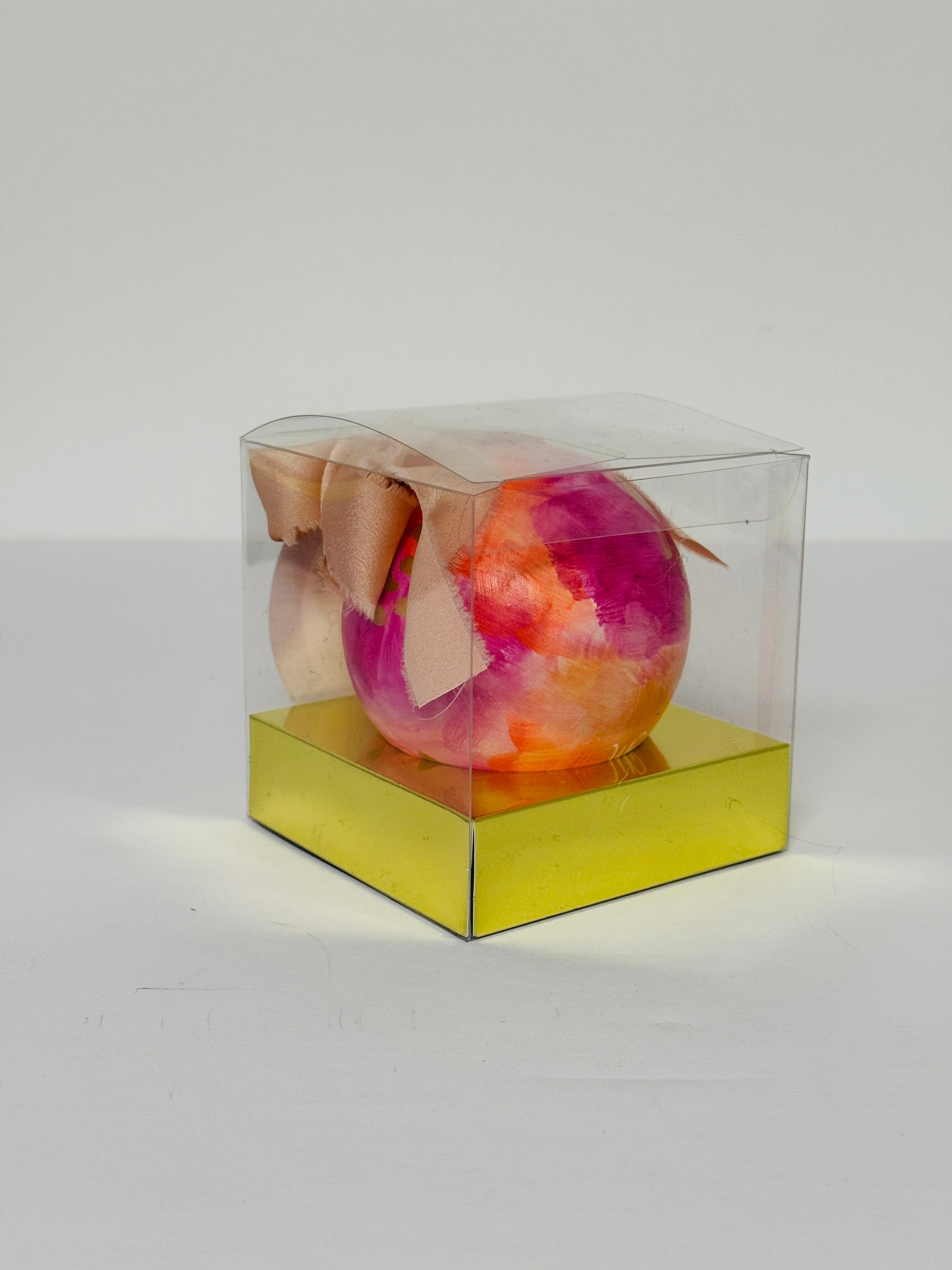 3” round ceramic ornament painted with tied ribbon. Comes with box ready to be gifted!