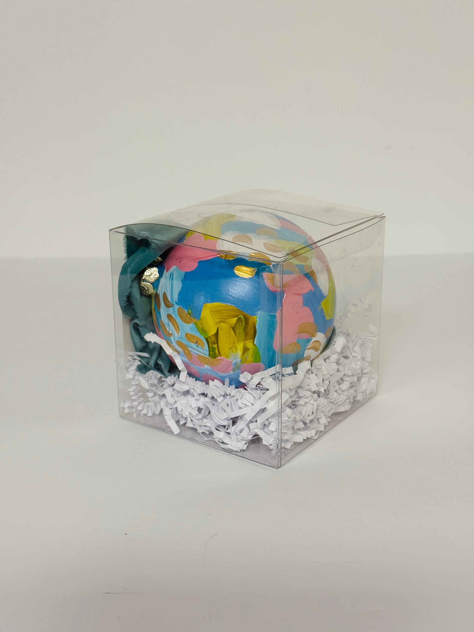 4” round ceramic ornament painted with tied ribbon. Comes with box ready to be gifted!