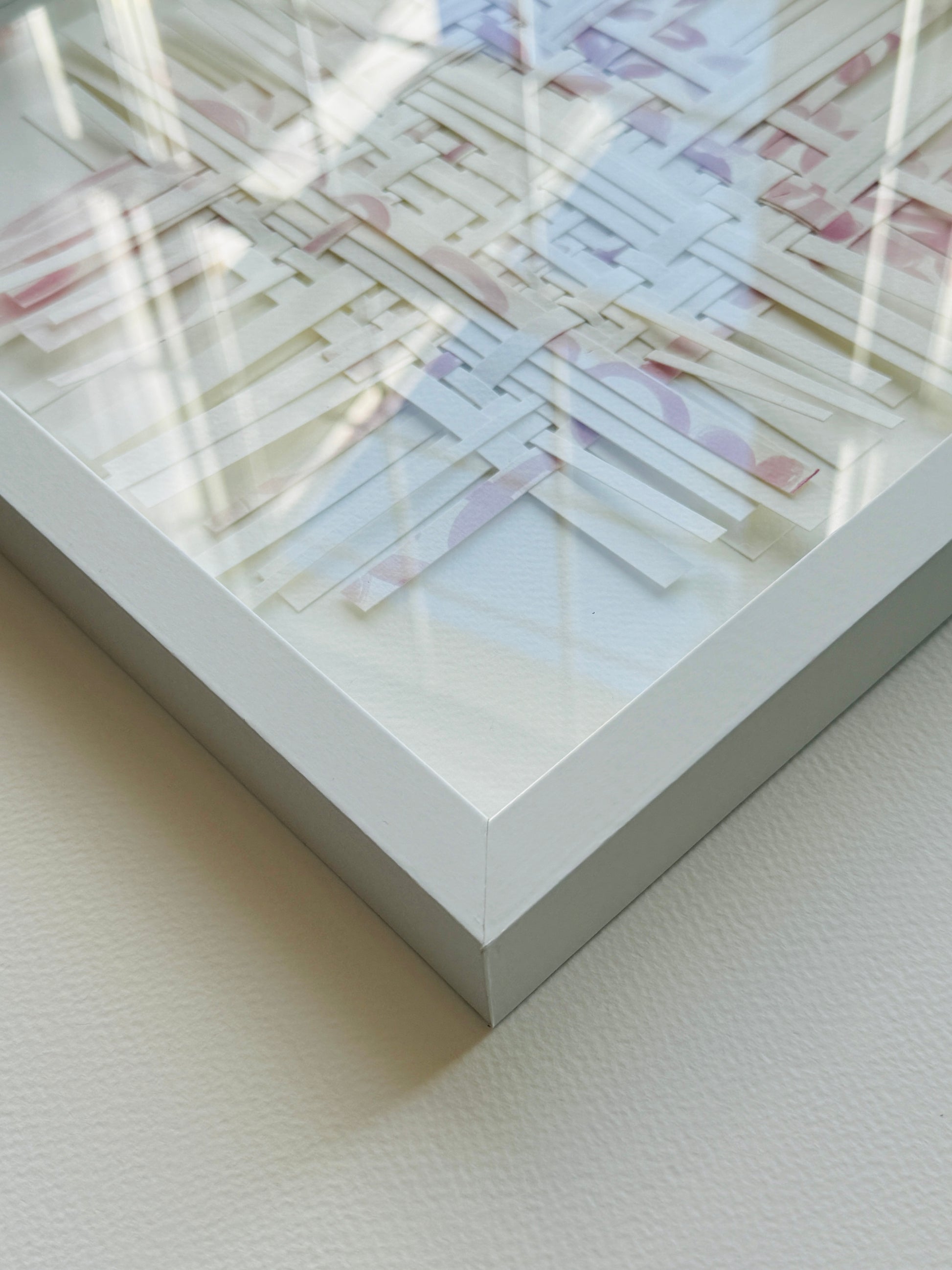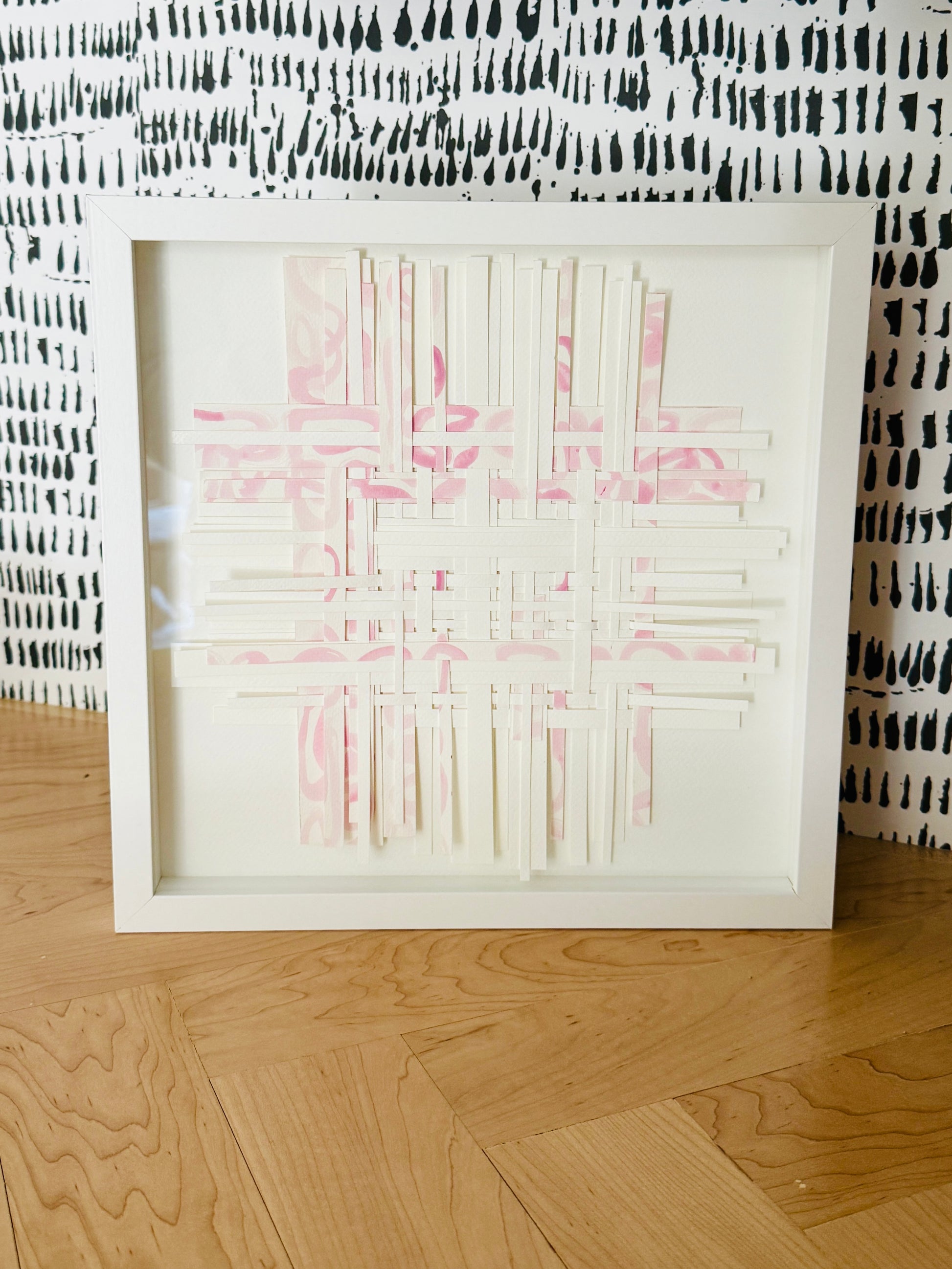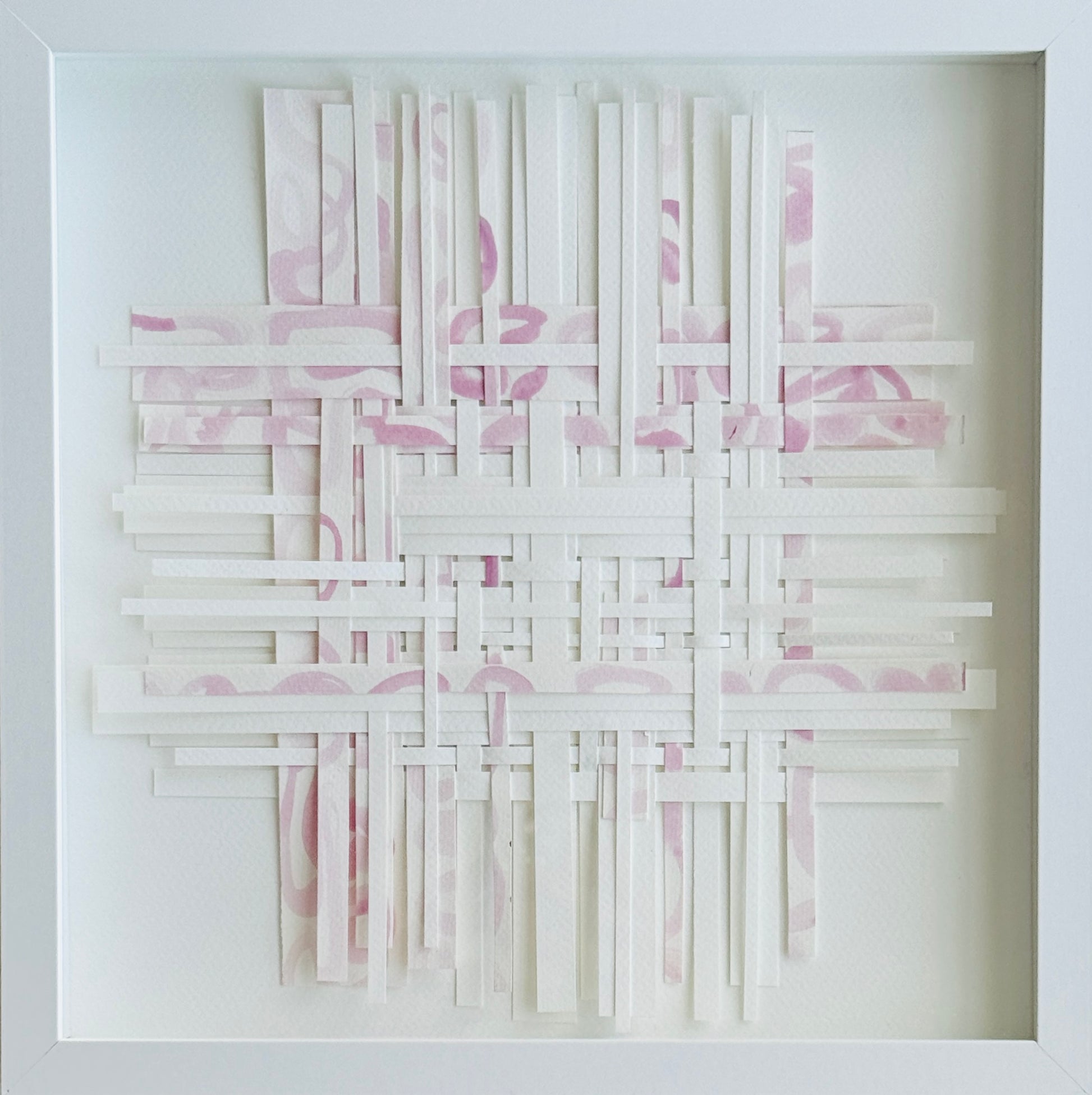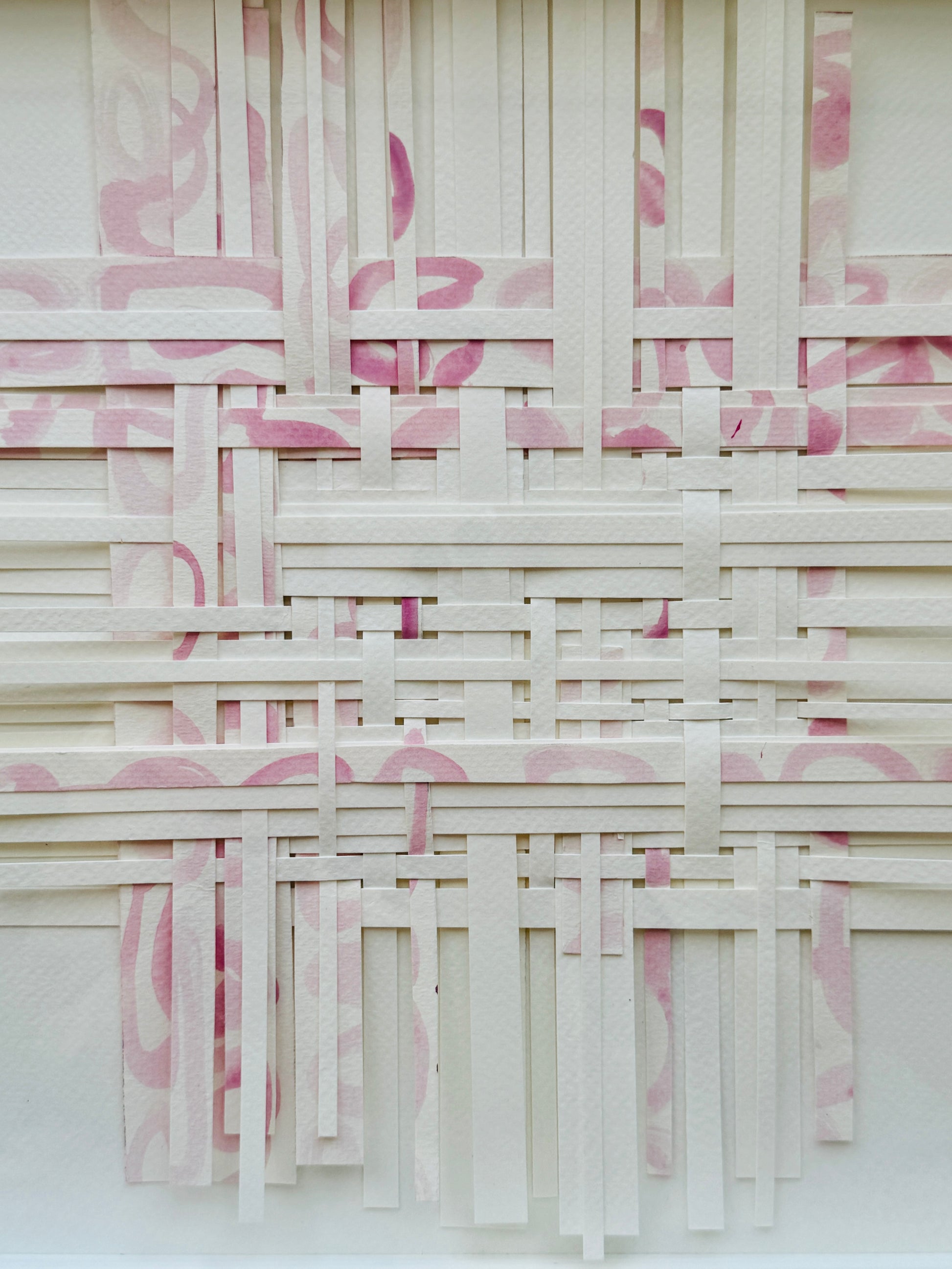 Hand painted acrylic on watercolor paper then cut into strips. Finally the pieces are woven and layered to create a multidimensional weaving