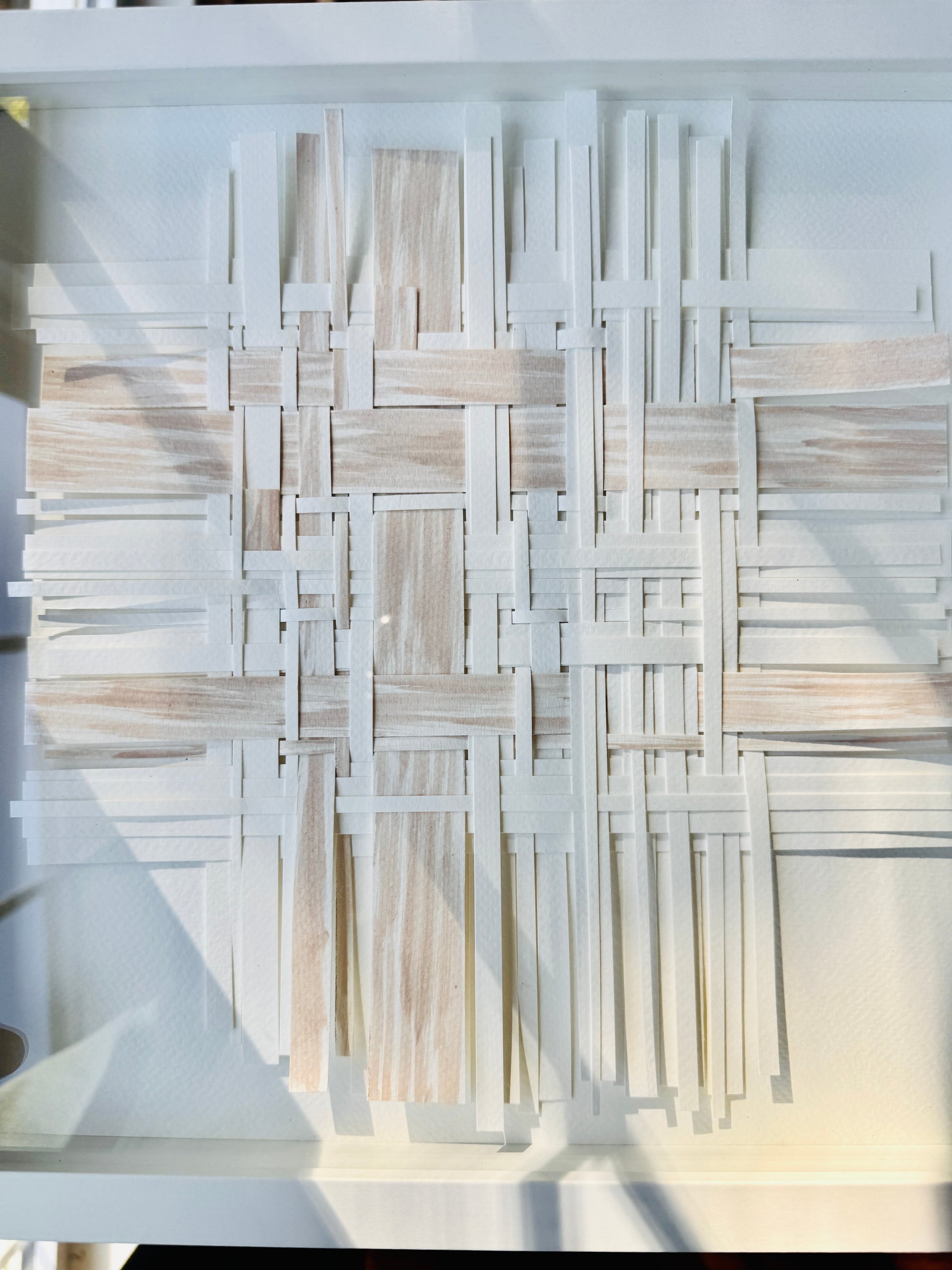 Hand painted acrylic on watercolor paper then woven and layered to create multidimensional weaving